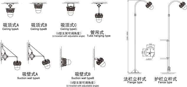 安裝方式:A:吸頂式 b:管吊式 c:吸壁式 d:法欄立桿式 e:護欄立桿式
