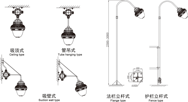 安裝方式:A:吸頂式 b:管吊式 c:吸壁式 d:法欄立桿式 e:護欄立桿式