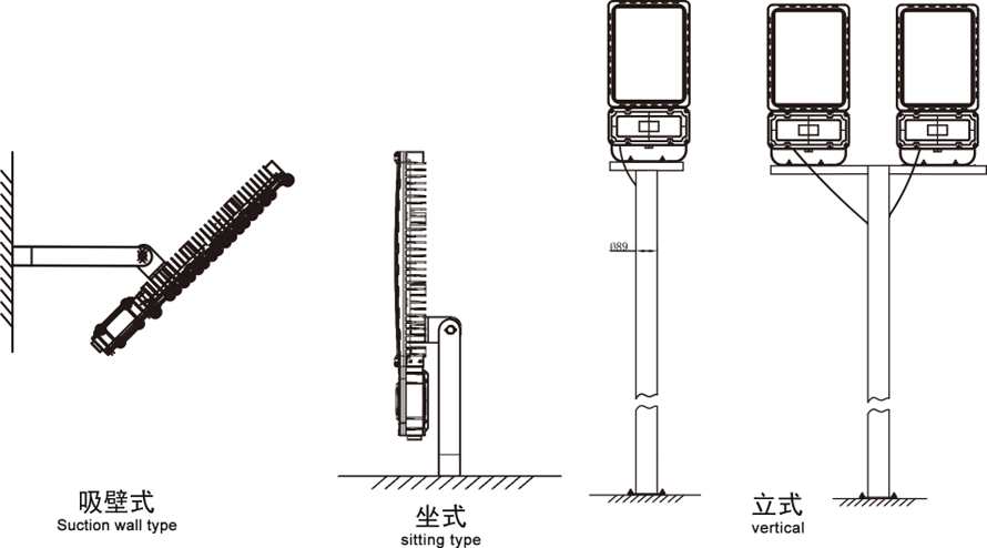 安裝方式:A:吸頂式 b:管吊式 c:吸壁式 d:法欄立桿式 e:護(hù)欄立桿式