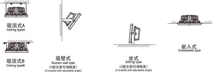 安裝方式:A:吸頂式 b:管吊式 c:吸壁式 d:法欄立桿式 e:護(hù)欄立桿式