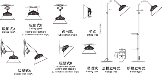 安裝方式:A:吸頂式 ?b:管吊式 ?c:吸壁式 ?d:法欄立桿式 ?e:護(hù)欄立桿式