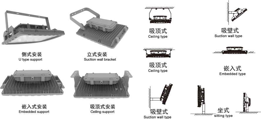 4.安裝方式:可跟據(jù)需要采用吊頂、吸頂,U型支架(調(diào)度可調(diào))等多種安裝方式。