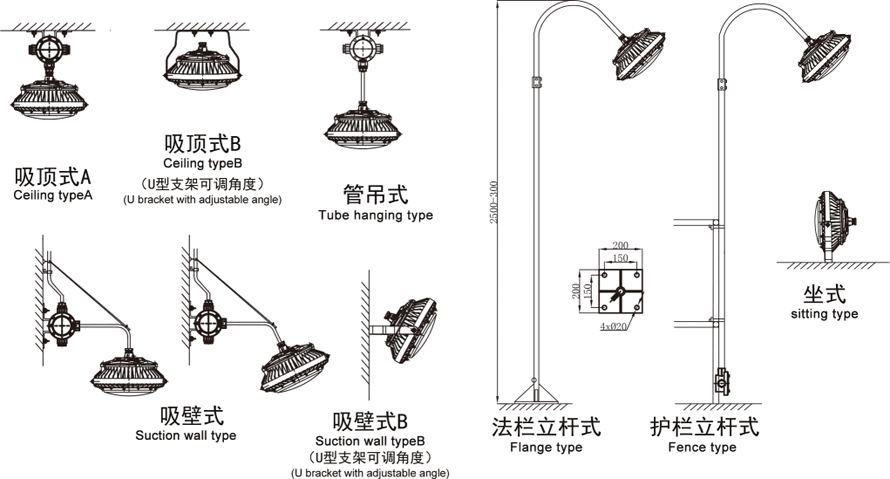 安裝方式:A:吸頂式 b:管吊式 c:吸壁式 d:法欄立桿式 e:護(hù)欄立桿式