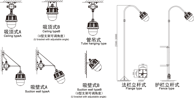 安裝方式:A:吸頂式 b:管吊式 c:吸壁式 d:法欄立桿式 e:護(hù)欄立桿式